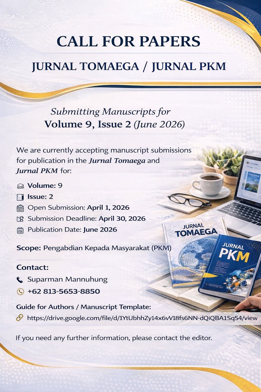 Jurnal To Maega : Jurnal Pengabdian Masyarakat, Tahun 2021 menerbitkan artikel tiga kali dalam setahun yaitu pada bulan Februari, Juni, dan Oktober. Artikel yang diterbitkan dapat diunduh secara gratis, dibaca dan didistribusikan sebagai referensi untuk penulisan artikel berikutnya. Artikel dikirimkan secara online dengan membaca PANDUAN PENULISAN JURNAL dan mengikuti TEMPLATE yang disediakan.